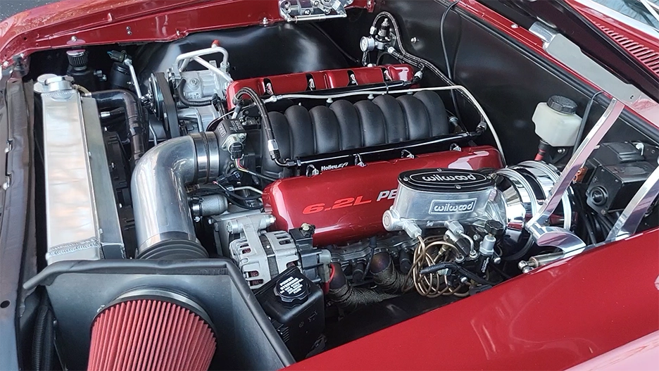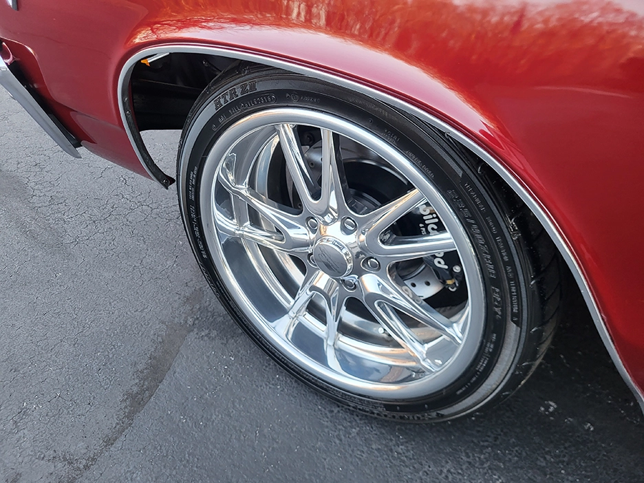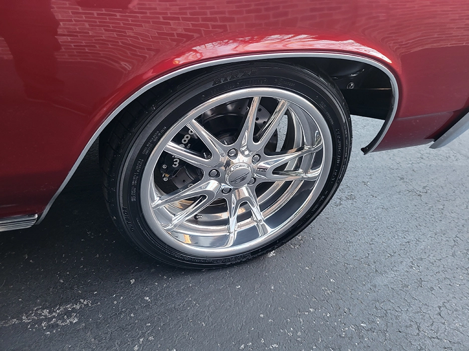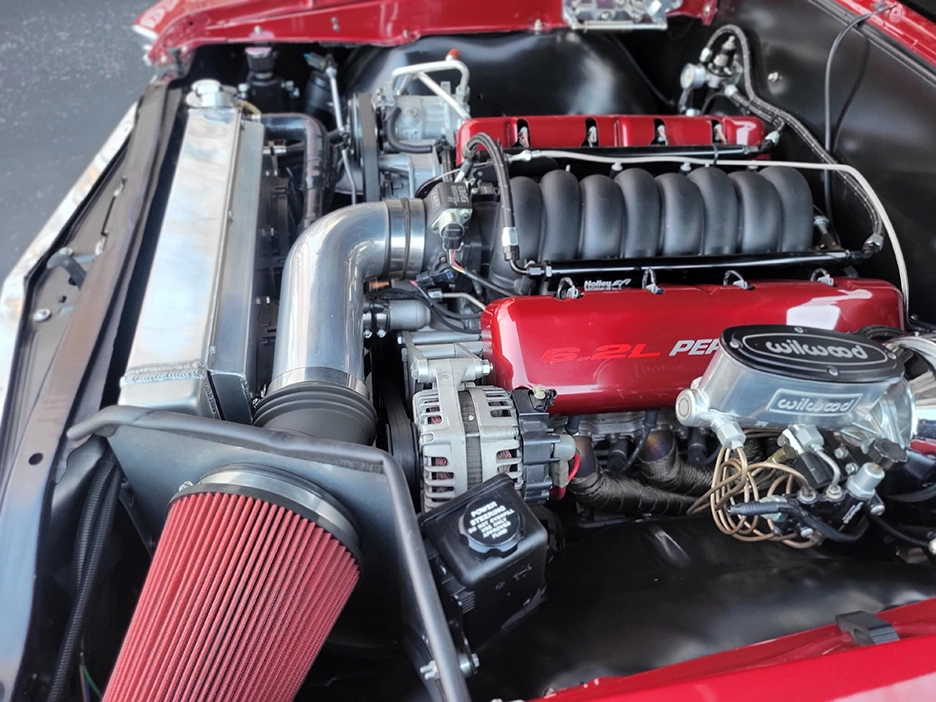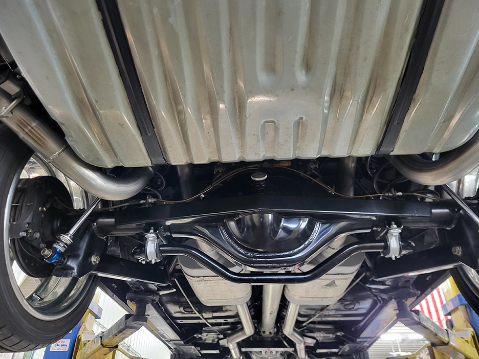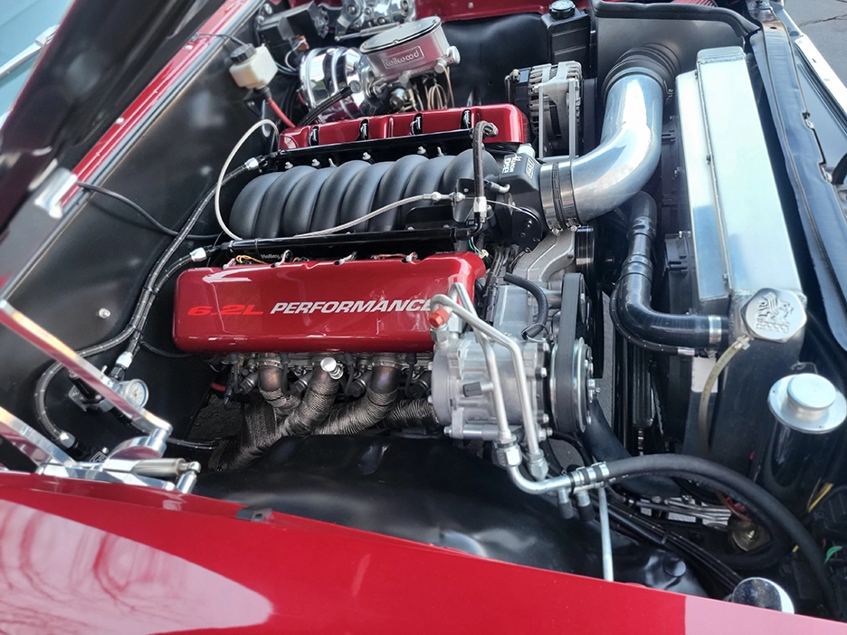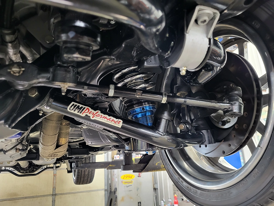 6.2 liter LS3 engine with 6-speed Tremec manual transmission, Moser 9-inch rear with 35splined axles, 3:89 gears, complete UMI suspension including front and rear tubular A-arms and adjustable shocks, Hellwig frame reinforcment kit with boxed site rails, fully powder-coated, driveshaft with front CJ joint, Wilwood power 13″ brakes, 4-wheel disc brakes.