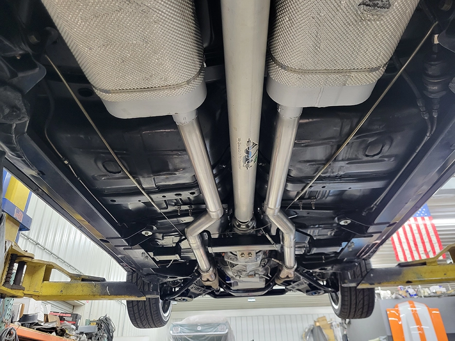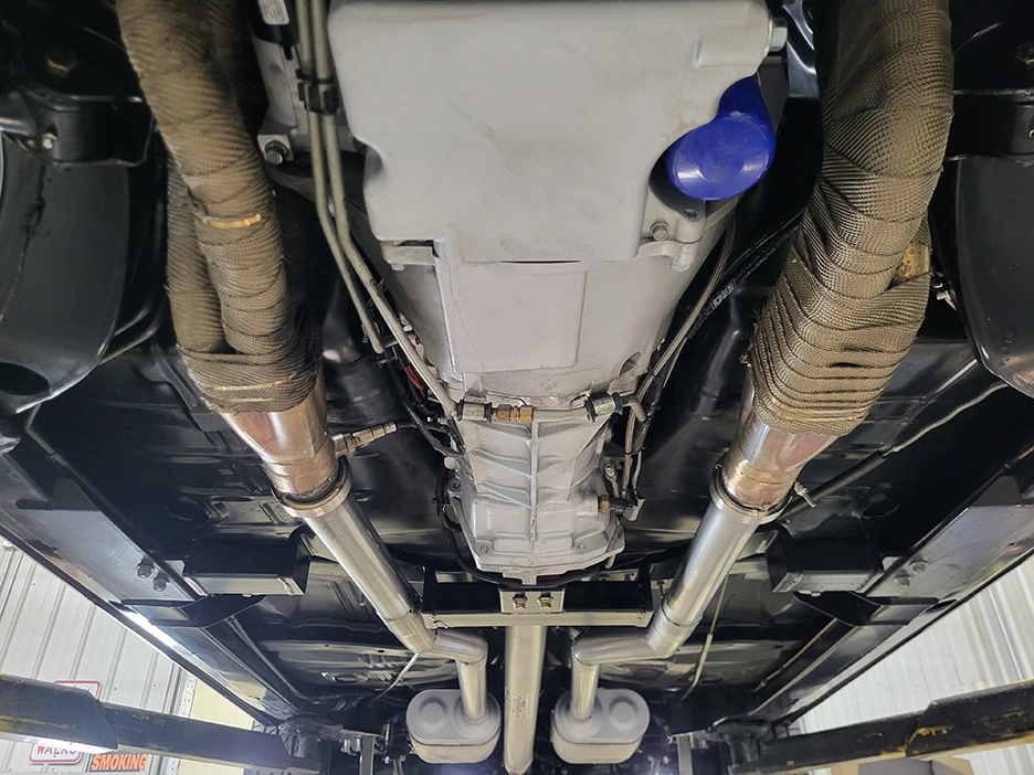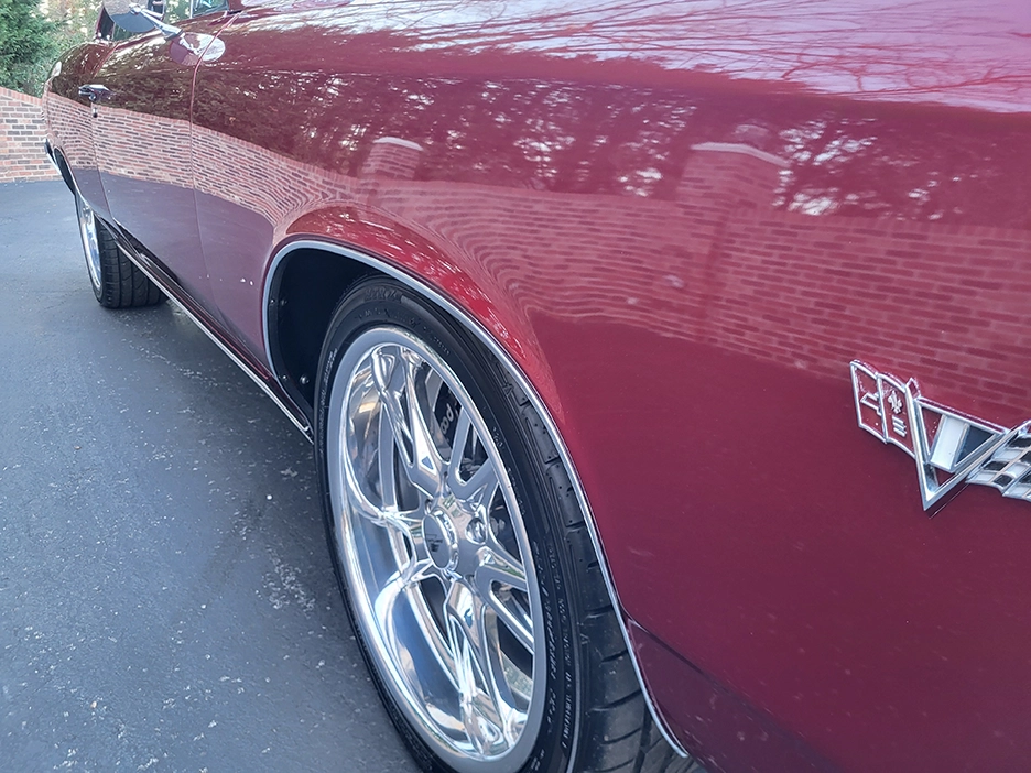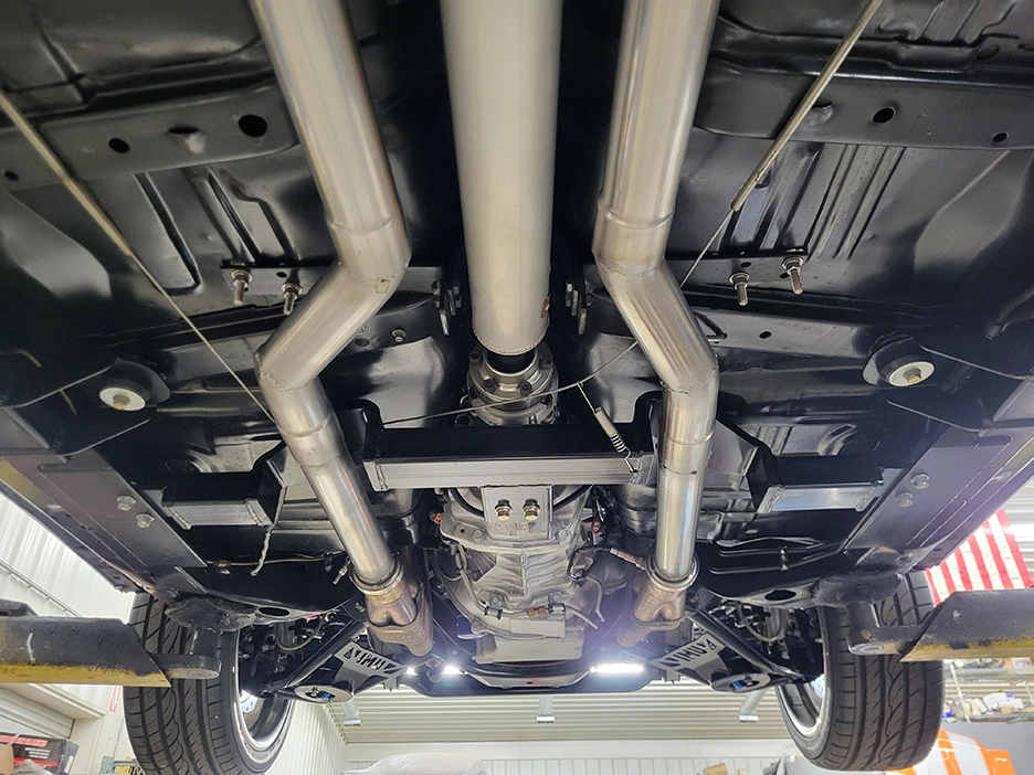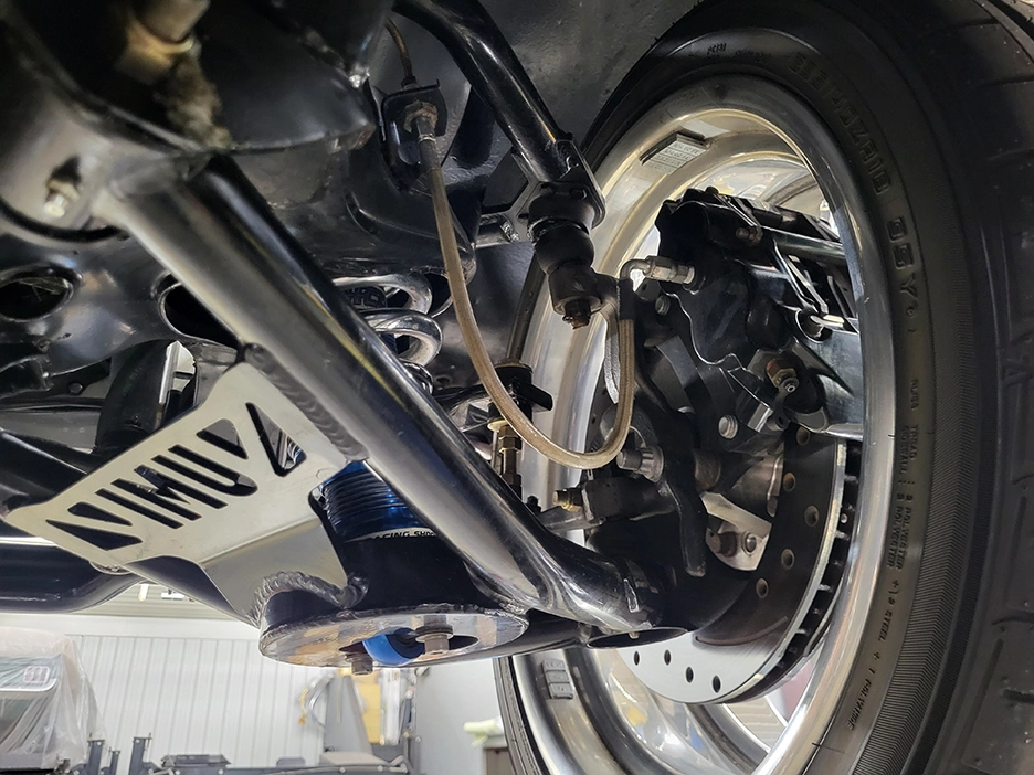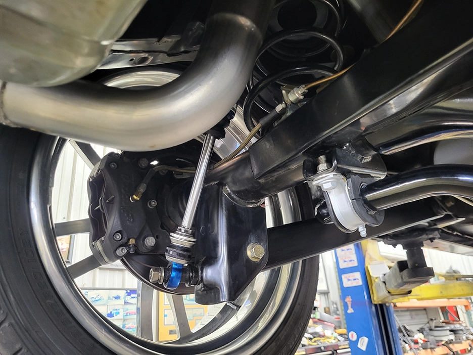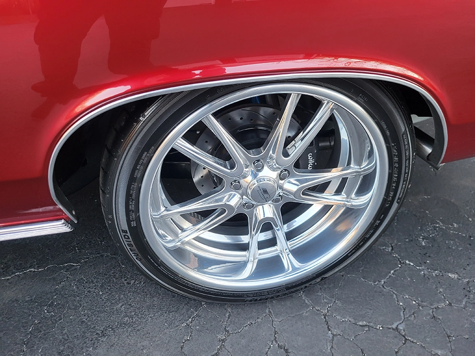 6.2 liter LS3 engine with 6-speed Tremec manual transmission, Moser 9-inch rear with 35splined axles, 3:89 gears, complete UMI suspension including front and rear tubular A-arms and adjustable shocks, Hellwig frame reinforcment kit with boxed site rails, fully powder-coated, driveshaft with front CJ joint, Wilwood power 13″ brakes, 4-wheel disc brakes.