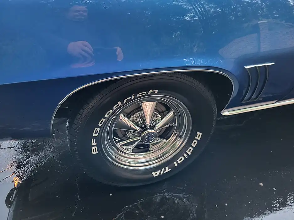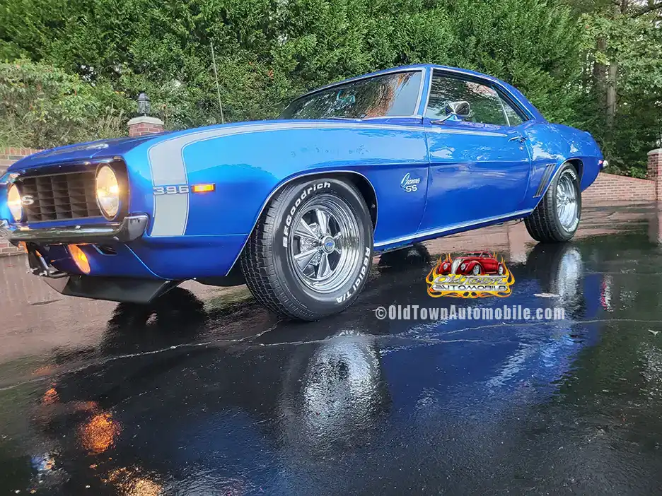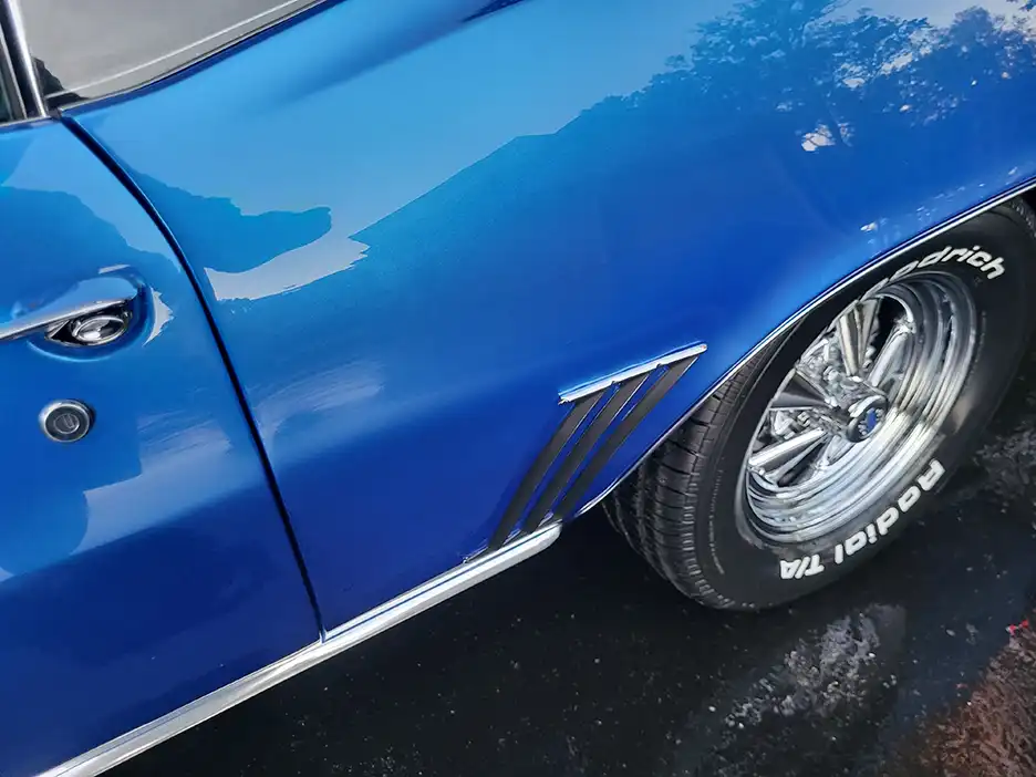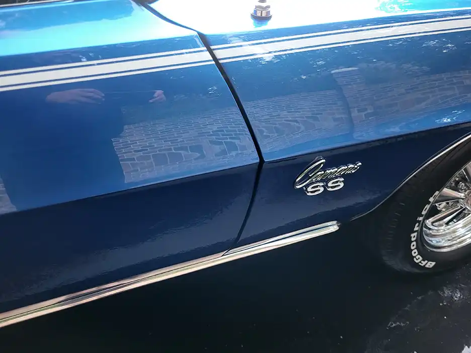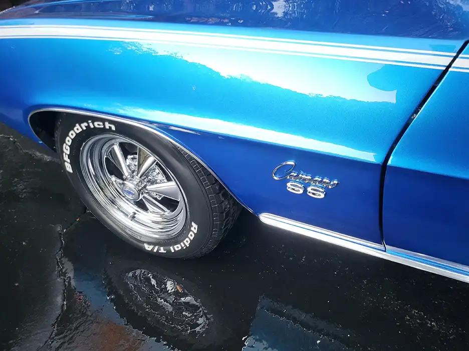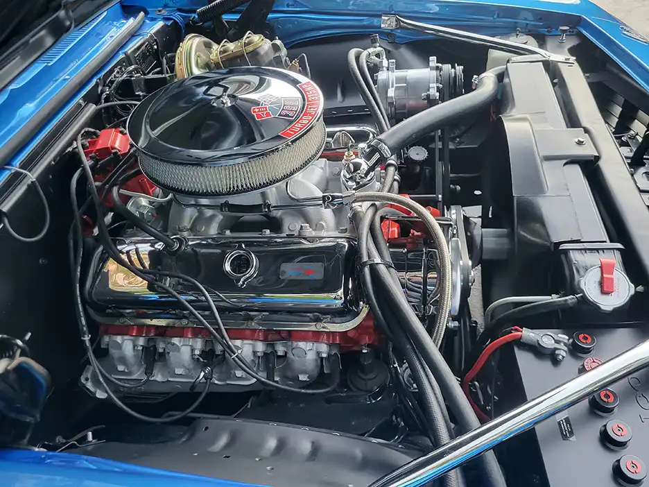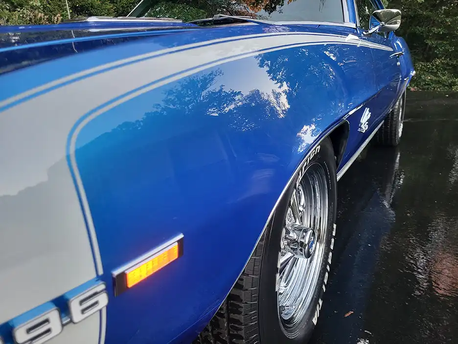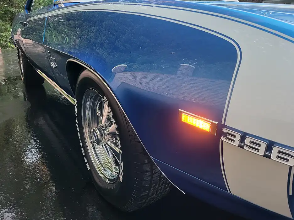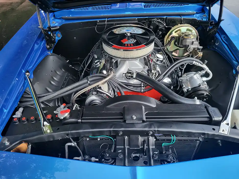 Fresh rotisserie restoration, straight, rust-free body and floors, show quality custom Lemans Blue paint, all new chrome and stainless, NOM 396/350hp engine, turbo 350 automatic transmission, 12 bolt 3.55 gear rear, power steering, power disc brakes, headers with dual exhaust and Flowmaster mufflers, new Cragar wheels and tires, all new stock interior, bucket seats, console, factory tachometer, gauges, tilt wheel, Retro Radio, Vintage heat and air conditioning, car runs out great.